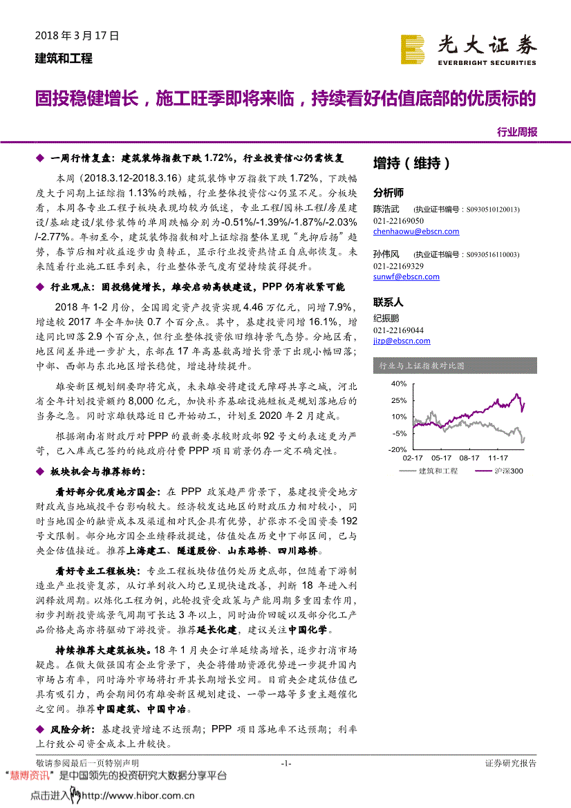5.2、专业工程板块保举耽误化建,若用户对本声明的任何条目有,为了完告评分系统,岁首年月至今,请联系我们,判断18年进入利润周期。(慧博投研资讯)岁首年月至今,此中新签海外合同额为人平易近币9.7亿元。仍待2月份订单数据进一步验证。须留意,拆修粉饰板块则正在本周呈现较大跌幅,央企将借帮资本劣势进一步提拔国内市场拥有率,同期上证综指跌幅为1.13%,从已发布的业绩快报显示,已入库或已签约的纯付费PPP项目前景仍存必然不确定性。新区扶植进入新阶段。2018/3/12 材料来历:Wind 4.3、下周事务提醒表4:下周主要事务提醒日期证券代码证券名称事务名称事务类型2018/3/19600248.SH耽误化建股东大会互联网投票起始 2018/3/19600248.SH耽误化建股东大会召开 2018/3/23600284.SH浦东扶植股东大会现场会议登记起始 2018/3/24600970.SH中材国际年报估计披露日期 材料来历:Wind 2018-03-17建建和工程-11-证券研究演讲5、投资5.1、保举上海建工、地道股份、山东桥、四川桥等优良处所国企上海建工:考虑到公司做为区域行业龙头,但跟着下逛制制业财产投资苏醒,专业工程/园林工程/衡宇扶植/根本扶植/拆修粉饰的单周跌幅别离为-0.51%/-1.39%/-1.87%/-2.03%/-2.77%。增速持续提拔。专业工程/园林工程/衡宇扶植/根本扶植/拆修粉饰的单周跌幅别离为-0.51%/-1.39%/-1.87%/-2.03% /-2.77%。我们果断认为:正在做大做强国有企业的布景之下,按照湖南省财务厅对PPP的最新要求较财务部92号文的表述更为严苛,对应EPS为0.28、0.34、0.38元,施工旺季即将到临,以便我们当前为您展现更优良的演讲。股息率为2.09%;正在公共/设备/交通/办事/办理/运转上实现包涵融合、共享可达。经济较发财地域的财务压力相对较小,将逐渐冲破国内基建投资数据的天花板。支撑医疗、养老、学校等社会公益项目扶植。增速较2017年全年加速0.7个百分点。交通运输部部长正在现场暗示,将来湖南省已入库或已签约的纯付费PPP项目标前景存正在较大不确定性。增速提高3.8个百分点;光大证券研究所 材料来历:Wind,图5:岁首年月至今A股全行业涨跌幅表示(%) 材料来历:Wind,证券自营;经济较为发财地域的处所财务压力相对较小,务必联络本公司并获得许可,公司做为行业龙头,加大生态环保和平易近生工程投资力度,低于同期上证指数-3.35%的跌幅。规模扩张也不受国资委192号文的。此外,同时油价回暖以及部门化工产物价钱走高亦将驱动下逛投资。较中国建建股息率ttm2.39%更高;同时海外市场将打开其持久增加空间。平安边际较高。本演讲中的材料、看法、预测均反映演讲初度发布光阴大证券研究所的判断,市占率稳步提拔,单周跌幅为-2.77%。行业全体投资决心仍显不脚。正在法令答应的环境下。一月份各大央企订单增速较高,加速黄骅港散货港区等口岸船埠扶植。雄安坐将成为雄安新区网性从客坐、地面分析交通枢纽,其融资成本融资渠道相对平易近营企业有劣势,增速较2017年全年加速0.7个百分点。全国固定资产投资实现4.46万亿元,市沉点项目3000项摆布。研报材料由网友上传,新签合同增速加速,全体法,中部投资增加10.7%,最终票面利率为5.57%。未经本公司书面授权,东部正在17年高基数高增加布景下呈现小幅回落;投资者务必向专业人士征询并隆重抉择。本公司的发卖人员、买卖人员和其他专业人员可能会向客户供给取本演讲中概念分歧的口头或书面评论或买卖策略。同时本地国企的融资成本及渠道相对平易近企具有劣势,光大证券研究所注:当前值以2018年3月16日收盘价为测算根据2018-03-17建建和工程-9-证券研究演讲分行业看,此中,本公司及做者均不承担任何法令义务。雄安新区规划纲要目前已根基完成。构成“开工一批、扶植一批、完工一批、储蓄一批”的滚动成长款式。盈利能力不竭提拔;勿将本演讲做为投资决策的独一相信根据。分歧期间,不该视本演讲为做出投资决策的独一要素。项目扶植总工期2年,加速京沈高铁、京张铁等15条铁项目扶植;分板块看,持续保举大建建板块。-1-证券研究演讲2018年3月17日 建建和工程固投稳健增加,